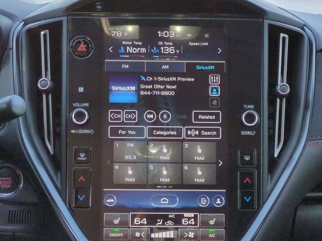 - Radio: Subaru STARLINK 11.6" Multimedia Plus Sys -inc: AM/FM stereo HD Radio, multi-touch gesture high resolution display screen, voice activated controls, voice activated navigation, Bluetooth® audio streaming connectivity, Bluetooth® hands-free phone connectivity, Bluetooth® hands-free SMS text messaging connectivity (applicable w/compatible cell phone), Near Field Communication (NFC), TomTom navigation software w/what3words, iPod control capability, rear-vision camera display, SiriusXM All Access radio (4 months free trial/subscription required after), SiriusXM w/360L (4 months free platinum trial included/subscription required after), SiriusXM Traffic (3 years free trial/subscription required after), SiriusXM Travel Link (3 years free trial/subscription required after), smartphone integration: Android Auto w/full screen view and wireless connection, Apple CarPlay w/full screen view and wireless connection, STARLINK cloud applications, USB and Over The Air (OTA) audio system update, 504 watt harman/kardon speaker system w/11 speakers and roof mounted audio, satellite and connected services antenna